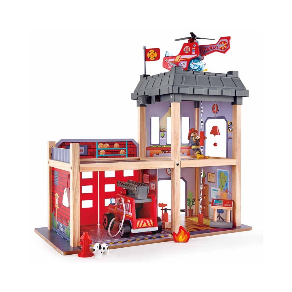 Caserne de pompiers à plusieurs niveaux et camion de pompiers Comprend une figurine de pompier et une figurine de chien de secours La manière dont le poteau de la caserne est conçu permet au pompier de descendre en tournoyant Les accessoires comprennent une hache, un extincteur, un hélicoptère, une flamme, une borne incendie, une antenne parabolique, un drapeau et un tableau de contrôle Comprend une cloche d'incendie à bouton-poussoir et une lumière. 2 piles AAA sont nécessaires (non incluses) Un mécanisme à corde met le camion en mouvement et ouvre la porte du garage Permet aux enfants de jouer tout en évoquant les consignes de sécurité par rapport au feu. Pour les enfants de 3 ans et +