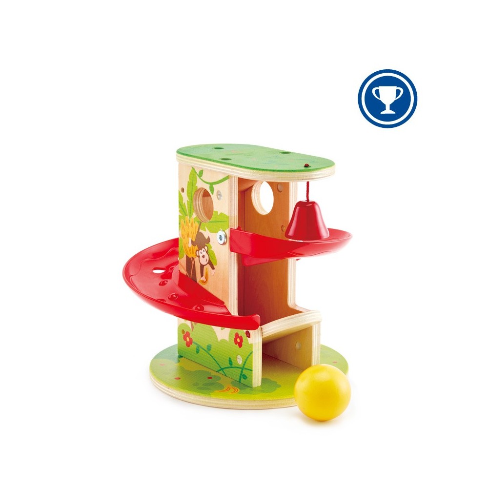 Jeu de toboggan à boule sur le thème de la jungle Le levier du bas lance la boule sur la rampe Une cloche sonne lorsque la boule passe au sommet du toboggan Une fois la boule arrivée en bas, utilise le levier pour recommencer Joli décor de jungle coloré avec un singe et une girafe Aide les enfants à développer une bonne coordination Pour les enfants de 12 mois et +